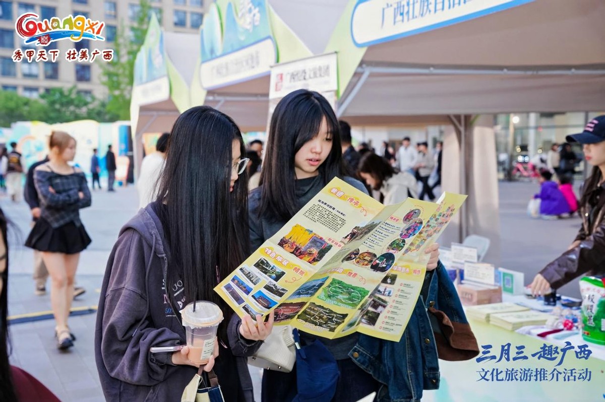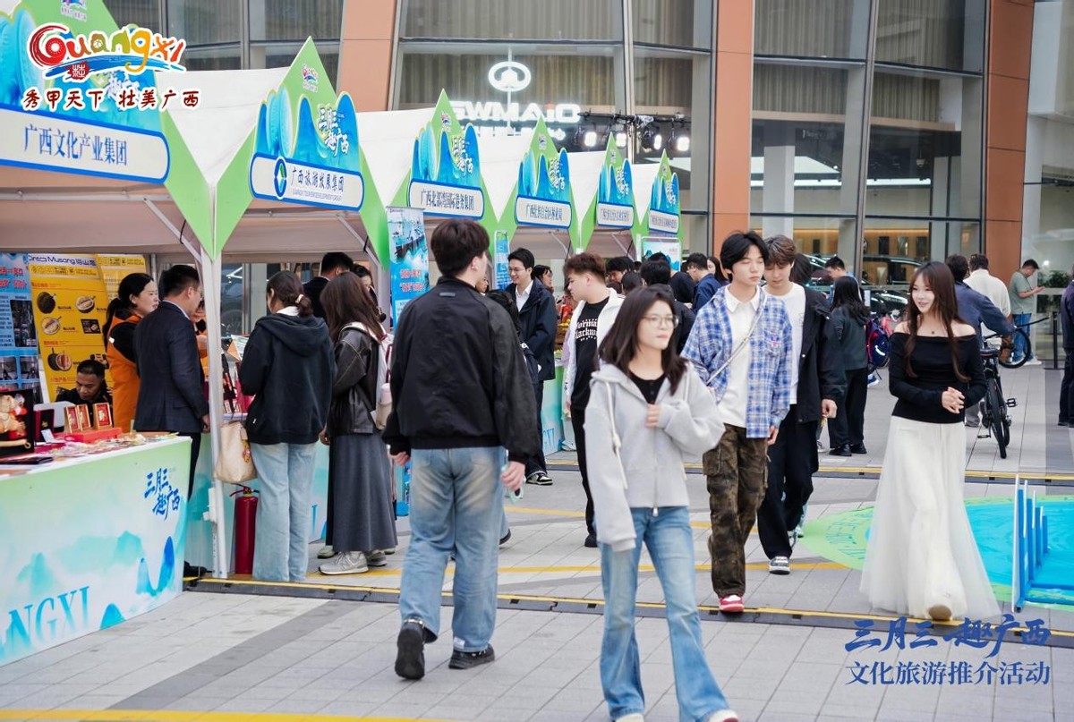 4月15日下午,文化旅游体验活动在杭州西溪天街正式启动,现场人气高涨,受到了周边学生、社区居民的热烈欢迎。广西14个设区市及各主协办单位设立特色文旅市集,集中展销广西文旅特色产品;通过民族文艺展演、特色美食品鉴、互动游戏体验、现场推介宣讲等形式,生动呈现广西多元民族文化内涵。活动现场发布“春假来广西,畅游畅购三月三”优惠政策、广西文旅精品线路、“跟着徐霞客游广西”春游线路、“下一站广西”240小时跨(入)境旅游线路及相关政策,让杭州市民近距离感受广西风土人情与文旅活力。