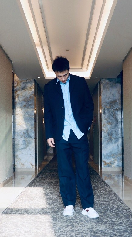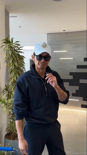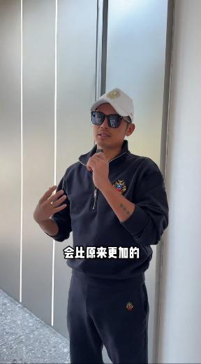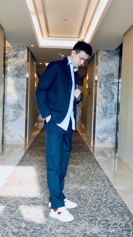 羽毛球运动员林丹穿着 Bally 男士蓝色运动 Polo 衫和蓝色休闲长裤,徽章刺绣突显质感细节,以随性造型感知日常松弛。
