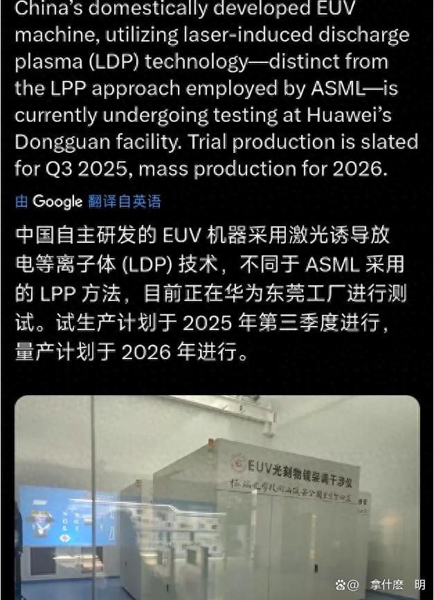 不同于ASML的激光轰击锡球(LPP)方案,中国团队采用激光诱导放电等离子体(LDP)技术:通过高压电极电离锡蒸气生成13.5nm极紫外光。该技术省去价值数亿元的高能激光器,设备体积缩小40%,能耗降低50%。