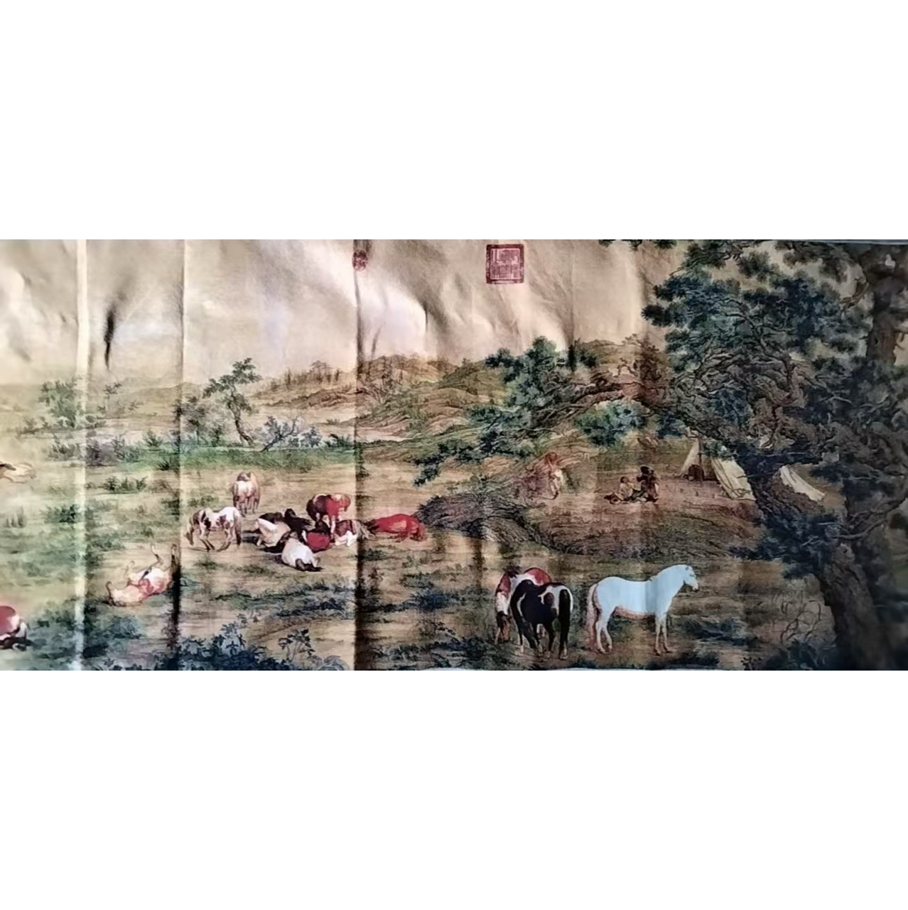 技法稀缺:郎世宁将西方解剖学、透视法与中国工笔重彩结合,马匹造型精准到 “每根毛发的动态”,山水背景兼具水墨意境与西方空间感,这种技法组合的难度使作品成为 “工艺孤品”;