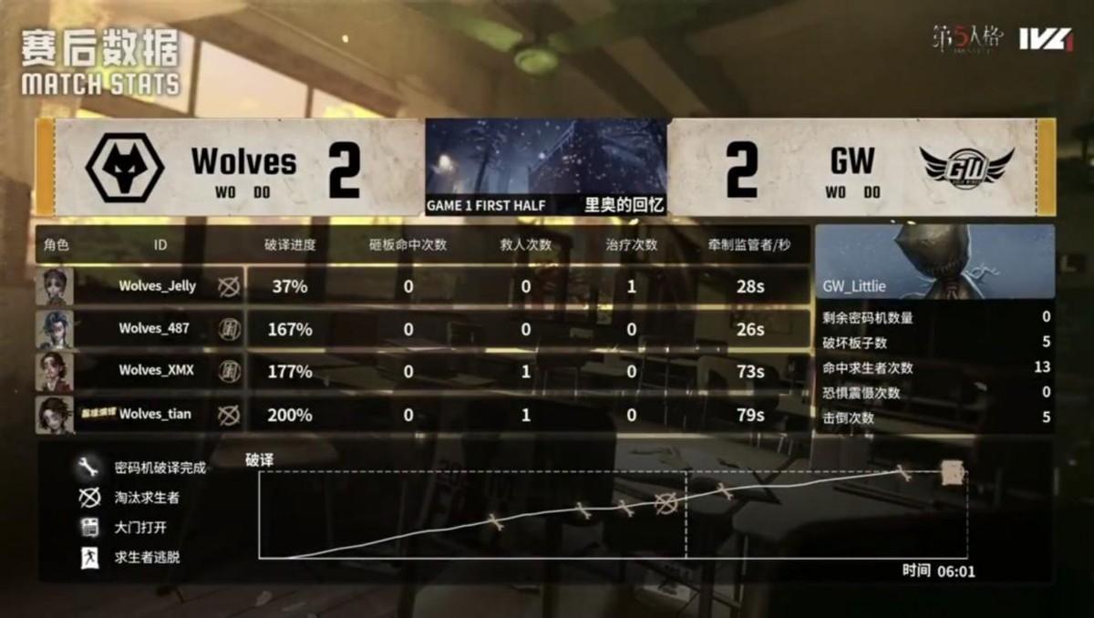 成都Wolves的求生者选择了机械师、大副、木偶师、“骑士”;GW的监管者Littlie选择了爱哭鬼。(BAN先知、古董商、幸运儿、飞行家)