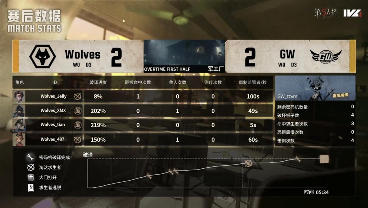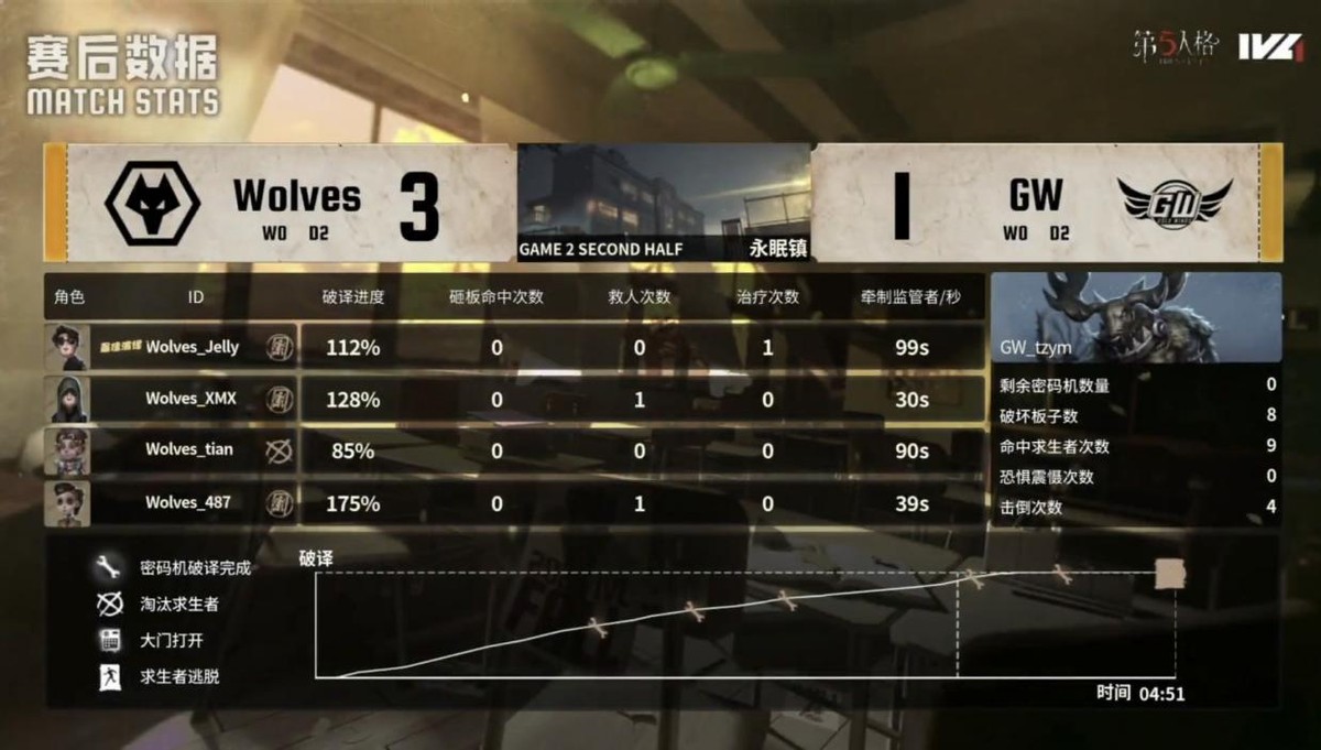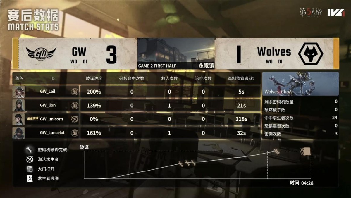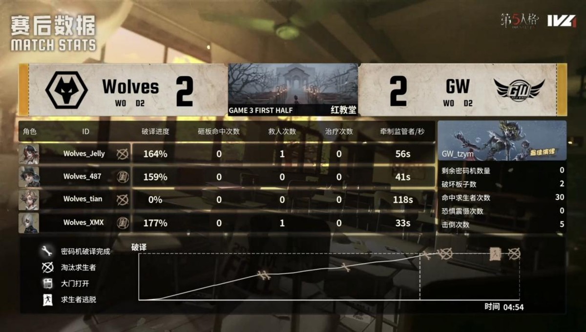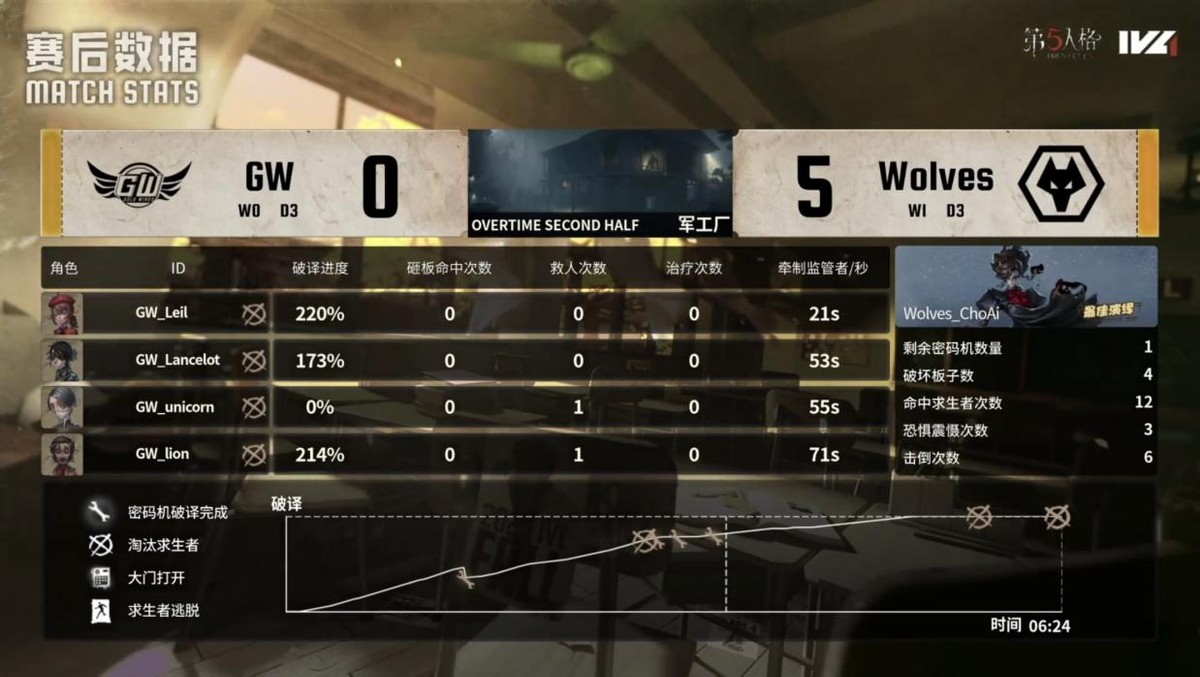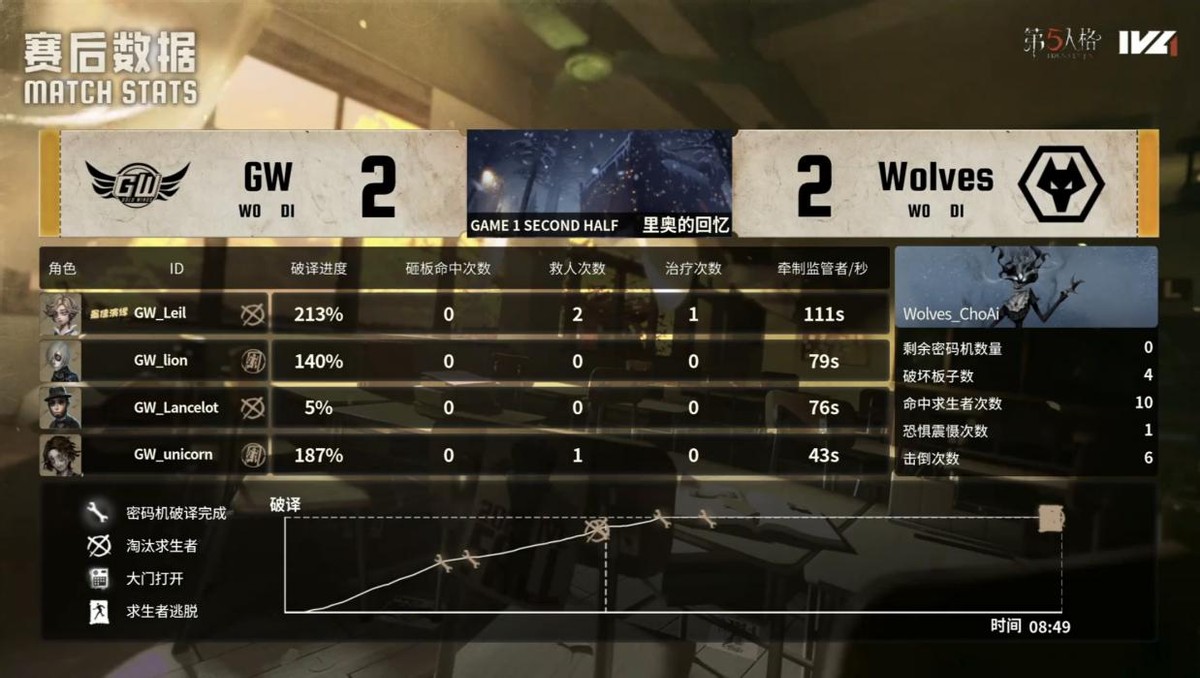 GW的求生者选择了木偶师、守墓人、气象学家、魔术师;成都Wolves的监管者ChoAi选择了时空之影。(BAN先知、古董商、大副、飞行家)