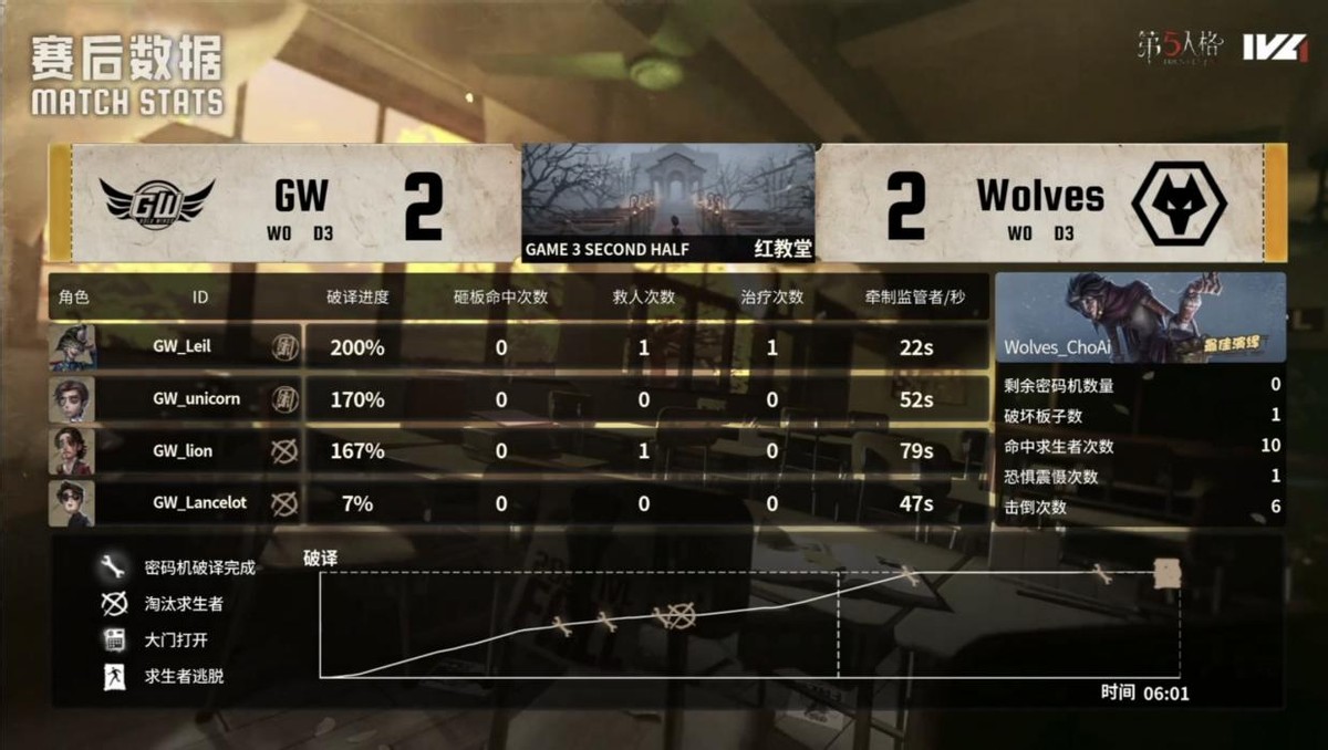 GW的求生者选择了古董商、佣兵、拉拉队员、飞行家(BAN“跛脚羊”);成都Wolves的监管者ChoAi选择了“喧嚣”。(BAN先知、火灾调查员、幸运儿、“逃脱大师”)