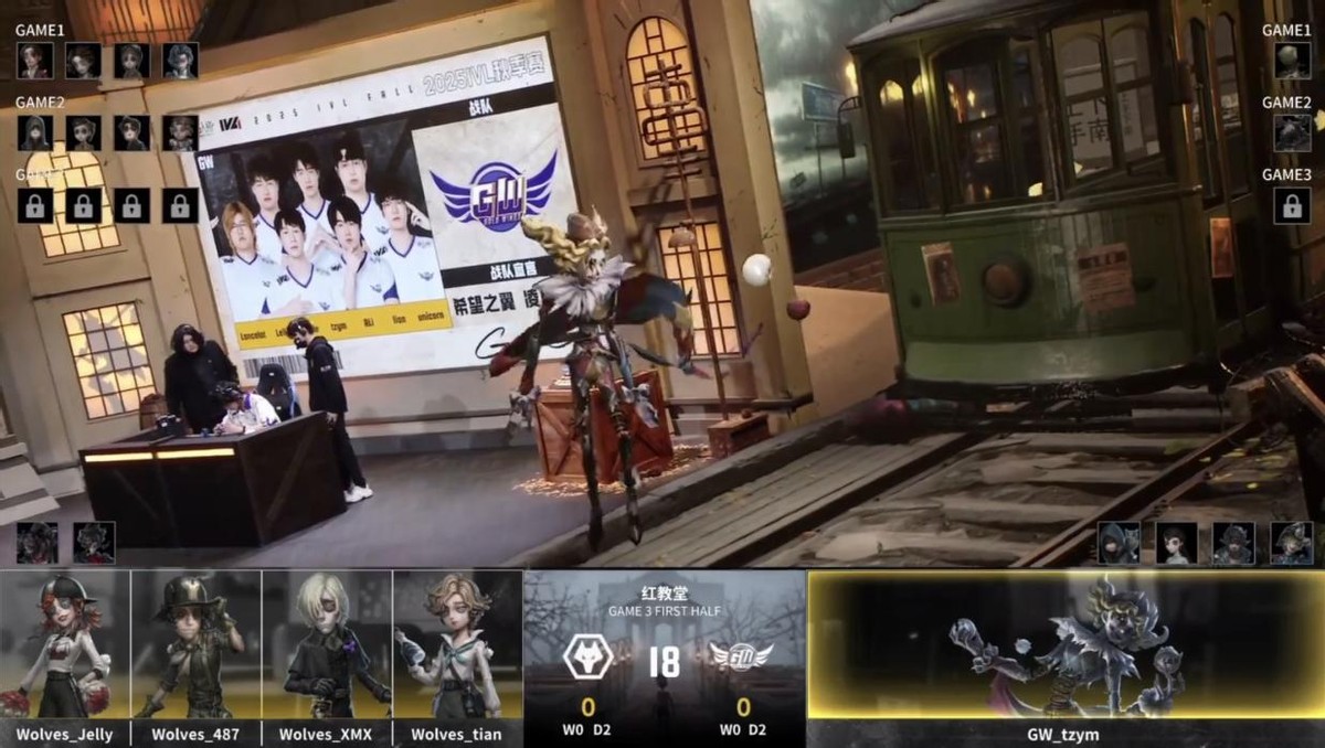 成都Wolves的求生者选择了小说家、邮差、飞行家、火灾调查员(BAN“跛脚羊”、歌剧演员);GW的监管者tzym选择了时空之影。(BAN先知、古董商、哭泣小丑、前锋)