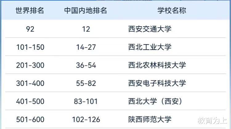 在这份榜单中,共计12所陕西省高校进入榜单,上榜高校既包括我国顶尖高校的西安交通大学、西北农林科技大学等,也包括陕西省属重点院校的陕西科技大学、西安科技大学等。