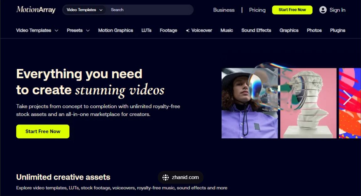 这里的模板常常带有强烈的艺术风格和创新的转场设计,尤其擅长电影感调色、光效和文字动画。即使不购买,浏览其网站也能获得许多前沿的设计灵感,学习如何将复杂的视觉效果优雅地结合在一起。