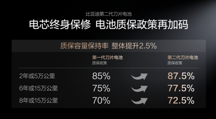第二代刀片电池通过打造“锂离子高速通道”和“全温域智能热管理系统”,实现了更低的产热和更高效、均匀的散热,让闪充对电池寿命几乎没有影响。基于这样的底气,比亚迪还宣布电池质保政策再加码!第二代刀片电池质保的“容量保持率”整体提升2.5%,电芯依旧是“终身保修”,这就是第二代刀片电池,给所有用户的安心承诺。
