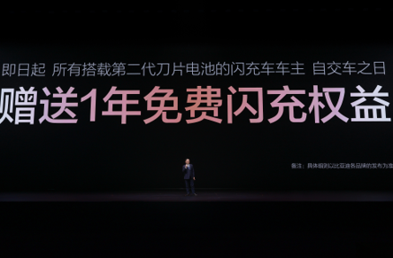 发布会现场,王传福还宣布:所有搭载第二代刀片电池的闪充车车主,均享有重磅“闪充权益”,自交车之日起,在全国闪充站可享受1年的免费闪充权益,让闪充体验更畅快。并且,在闪充免费期结束后,比亚迪闪充站也会同行业保持一致,不会额外收费。
