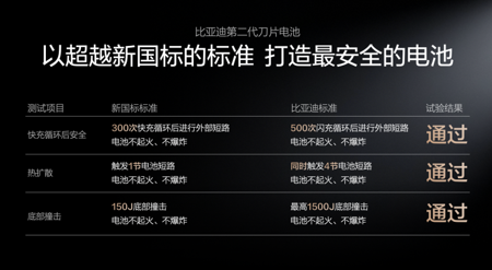 第二代刀片电池继续将安全进行到底,通过一系列超越新国标的安全测试,为用户打造最安全的电池,确保电池全生命周期都安全,彻底打消用户的安全顾虑。