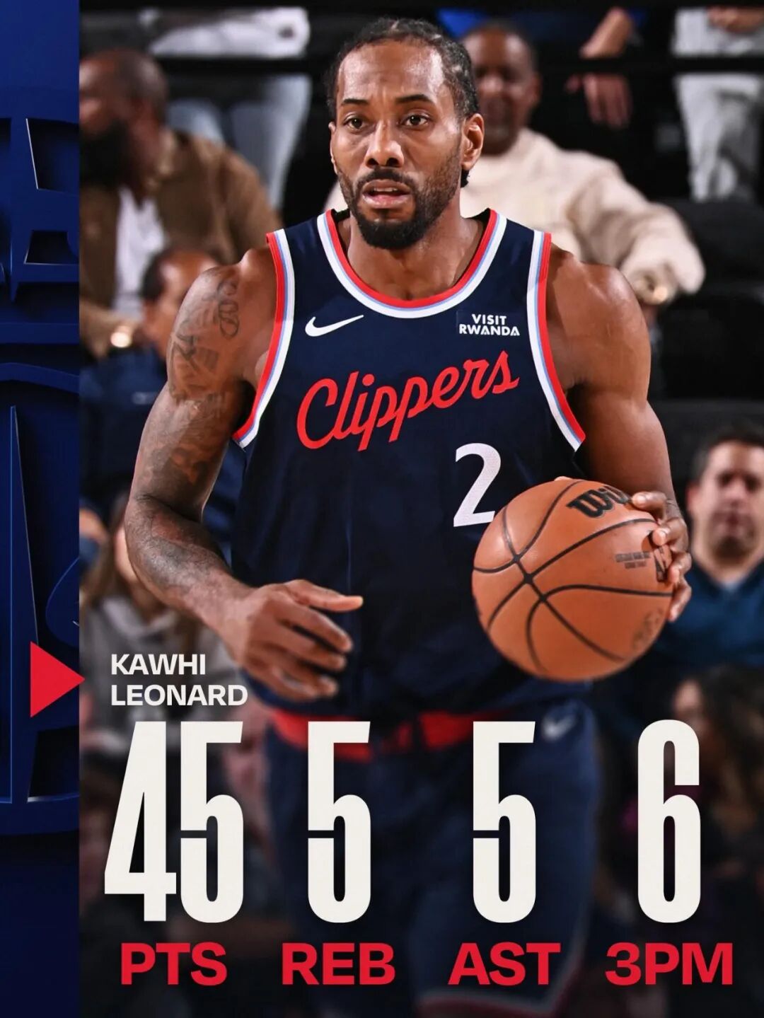 45分追平了伦纳德的生涯第二高分(此前曾两次拿到过45分),同时这也是伦纳德本赛季的第5次40+,此前他曾单场拿过55分、45分、41分、41分。