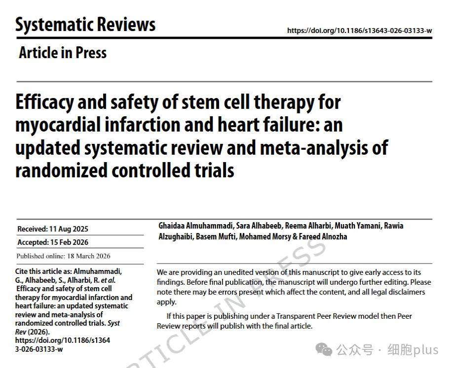 这篇最新发表在《Systematic Reviews》的系统评价与荟萃分析(Almuhammadi et al.),纳入了35项随机对照试验(RCTs),共计3345名患者,对干细胞治疗缺血性心脏病(IHD)和心力衰竭的疗效与安全性进行了全面更新评估。