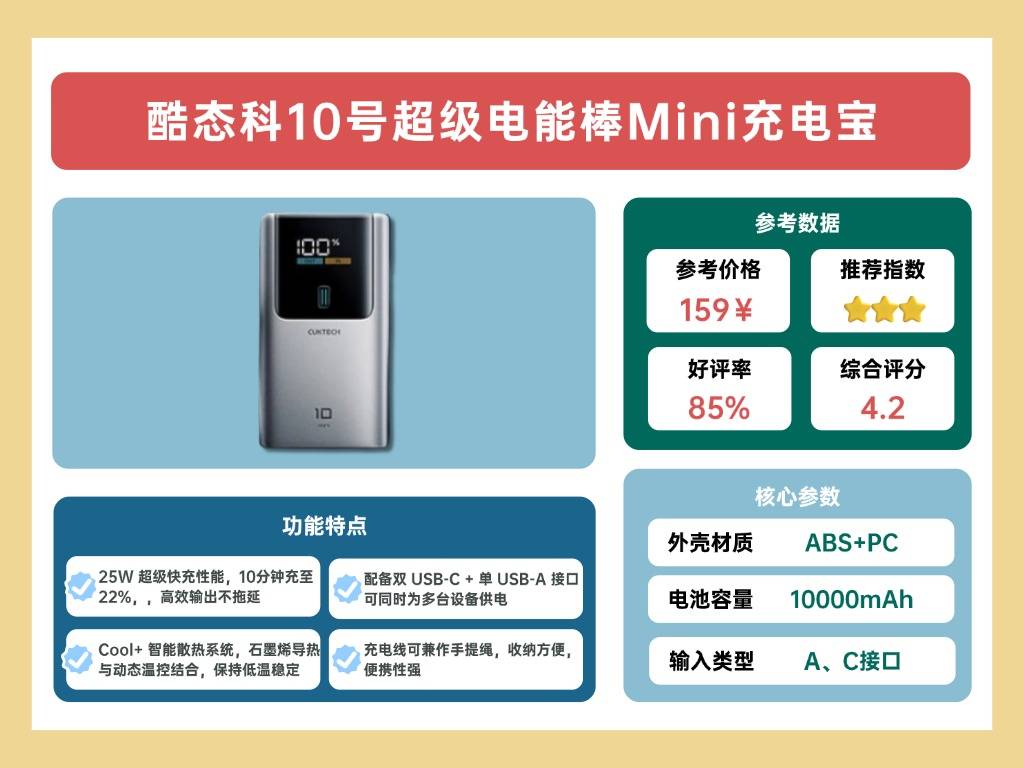 酷态科 10号超级电能棒 Mini 的容量为 10000mAh,额定容量 5600mAh,主打高效散热与快充体验。机身配备大尺寸数显屏幕,可显示功率与电量信息,方便直观。内部采用 Cool+ 超能散热系统,结合石墨烯导热铜箔与动态温控技术,有效降低发热。