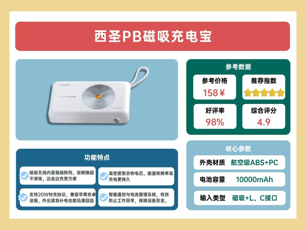 在磁吸充电宝领域,西圣PB是近年来口碑好到炸裂的一款了,它在充电速度和品质安全上长期稳居充电宝品类第一梯队。也还打造出众多权威媒体公认的“天花板级安全下的高性能充电宝”,其充电技术屡次突破改写颠覆了充电宝行业标准、技术上限,做到充电快,不发烫,更安全!