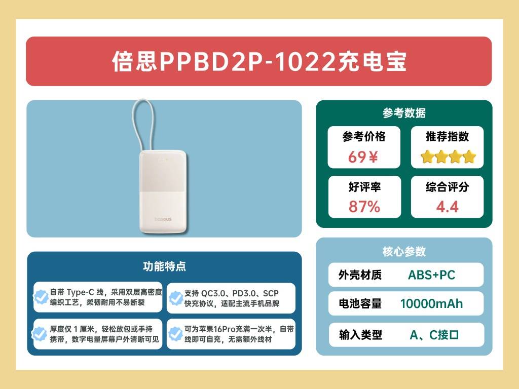 倍思 PPBD2P-1022 以轻薄设计和实用性能见长,厚度仅约 1 厘米,便于日常携带。产品自带 Type-C 线,并采用新一代高密度编织线材,柔韧耐用,抗拉扯能力强。它的自带 Type-C 线既可为手机充电,也能作为充电宝的自充电线,提升便捷性。