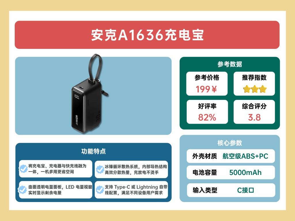 安克 A1636 以“三合一设计”为核心卖点,集充电宝、充电器和充电线于一体,体积小巧,可单手握持。它提供多种配色,整体风格清新简约。容量为 5000mAh,额定容量 3000mAh,可选择配备 Type-C 或 Lightning 接口版本,兼容性较强。机身侧面采用曲面清透面板,触感圆润,并配备 LED 电量视窗,方便查看剩余电量。