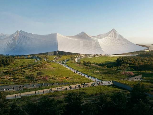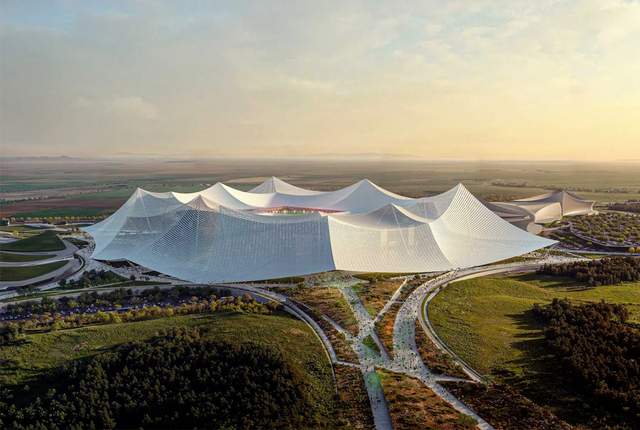 项目由巴黎的Oualalou + Choi事务所与Populous合作设计,其方案灵感源于摩洛哥传统节庆中使用的帐篷,屋顶以半透明铝材与膜材复合而成,轻盈而坚固,既能过滤自然光线,又塑造出独特的现代轮廓。