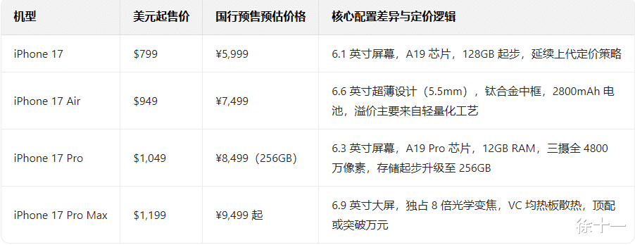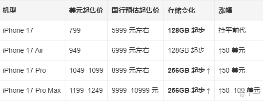 iPhone 16 Pro Max(256GB/9999元、512GB/11999元、1TB/13999元),据此推测,iPhone 17系列国行或涨价约500元。