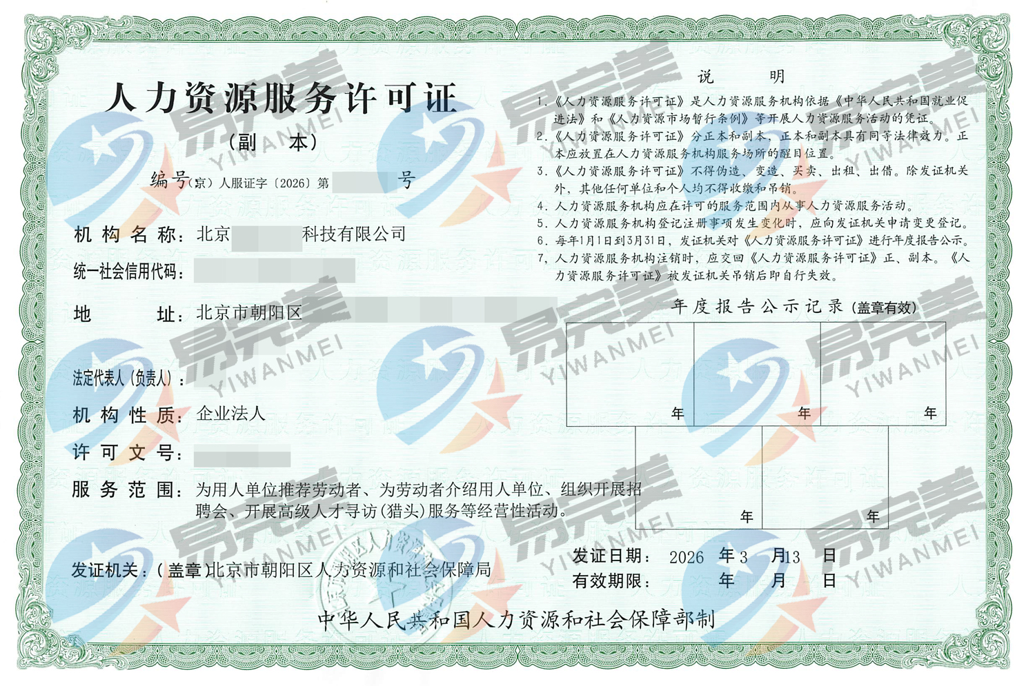 北京新下2026年03月13日人力资源服务许可证