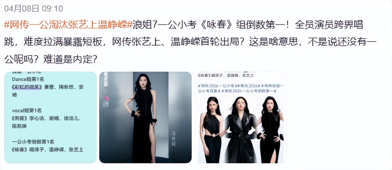 更离谱的是,录播还没上线,一公小考成绩、淘汰名单就先全网疯传,《咏春》组倒数第一、温峥嵘张艺上被淘汰的消息,瞬间冲上热搜,把本就混乱的节目,搅得更扑朔迷离。