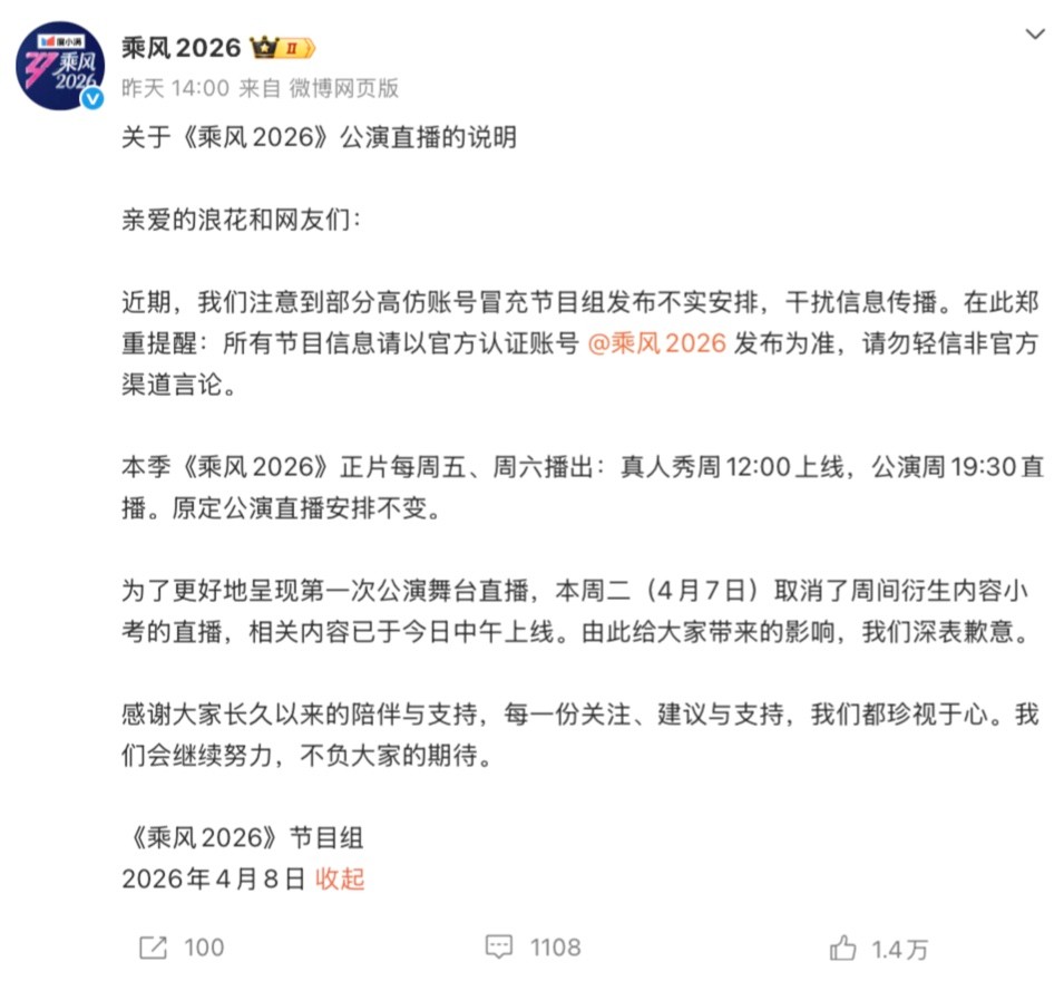 如今一公淘汰名单传得沸沸扬扬,直播改录播的争议还没平息,《乘风2026》虽热度拉满,却丢了最珍贵的“真诚”。
