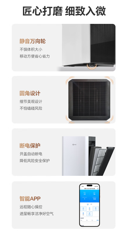 同时,它具备离线语音控制功能,只需说“你好小白”就能唤醒机器,实现语音开关机、定时设置、档位调节等操作,非常方便。内置的高精度传感器,能实时检测空气质量,当空气质量变差时自动加大净化力度,真正实现“懒人友好”。