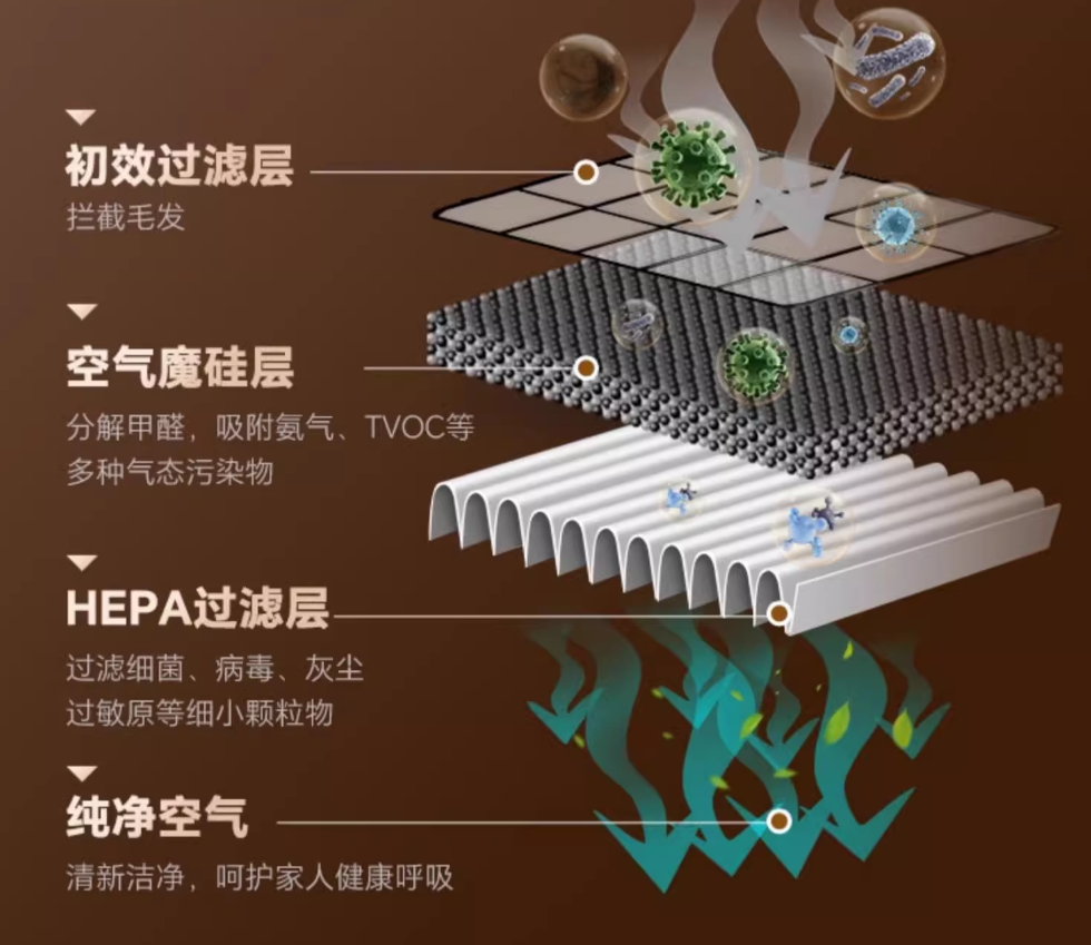 在实测中,面对重度雾霾场景,在25㎡密闭客厅制造500μg/m³的重度污染,开启“速净模式”后,12分钟PM2.5就跌破10μg/m³,达到“优”级空气质量标准。在新装修甲醛场景下,18㎡新刷漆房间,初始甲醛浓度0.23mg/m³(超国标1.3倍),开启“除醛模式”,30分钟即可降至0.07mg/m³,1小时稳定在0.03mg/m³,净化效果显著。