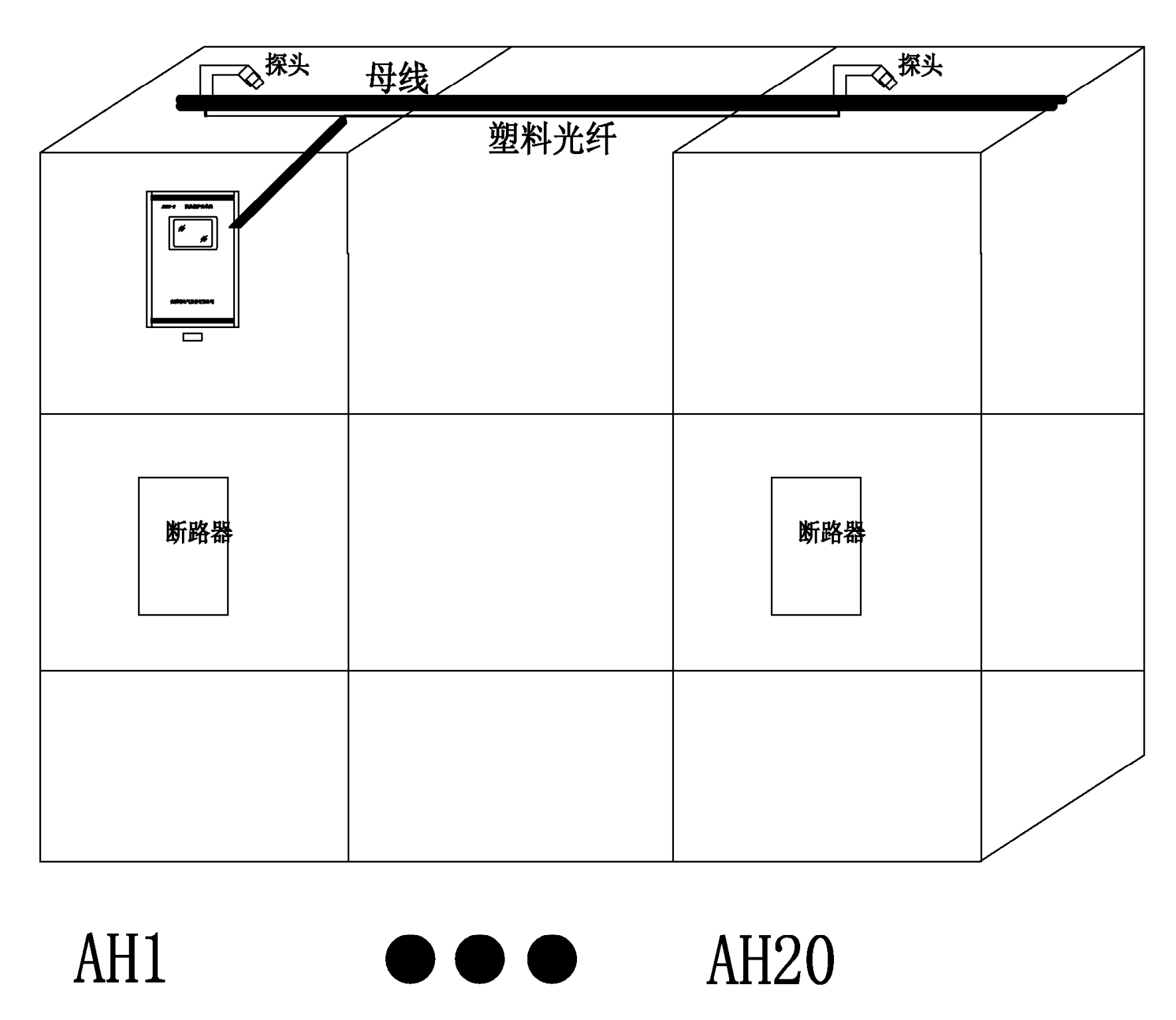 该配电间,在每面高压柜的母线室安装1个ARB-S弧光探头,在进线柜分别配置1台ARB6系列弧光保护装置采集弧光探头信号并跳闸出口。