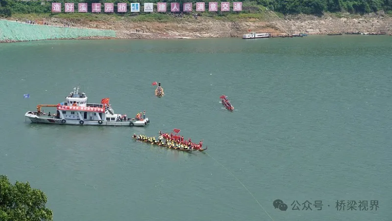 6月6日上午11时10分,随着现场总指挥一声令下,在海事部门的全程护航下,四艘龙舟两两为伍,分别从大桥南、北两岸出发,伴随着鼓点和呐喊,桨手们甩开臂膀,奋力划桨,龙舟牵引着先导索驶向江心。