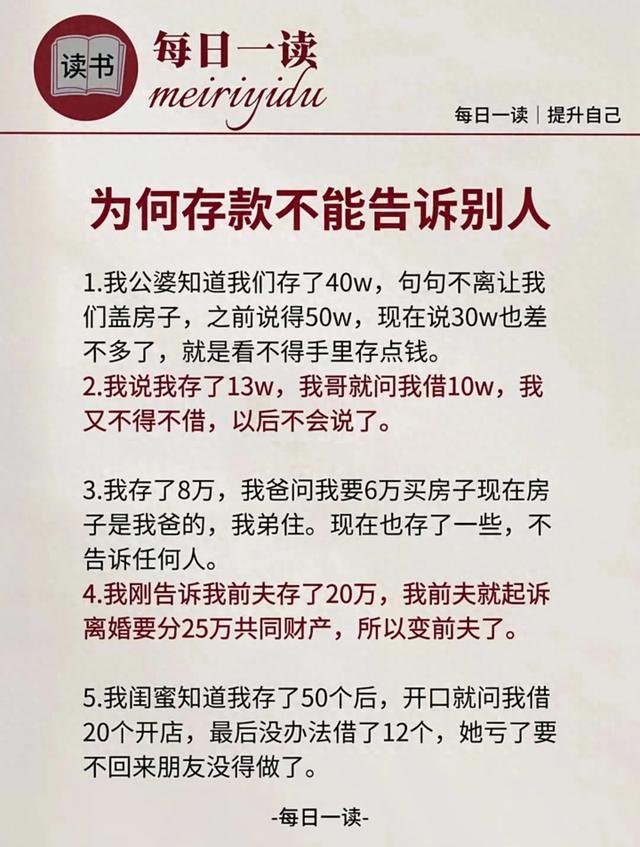 确实,在这个人情社会里,存款就像一面镜子,照出世间百态。有人见钱眼开,有人心生嫉妒,更有人打着亲情友情的旗号占便宜。保持低调,既是对自己的保护,也是对关系的维护。