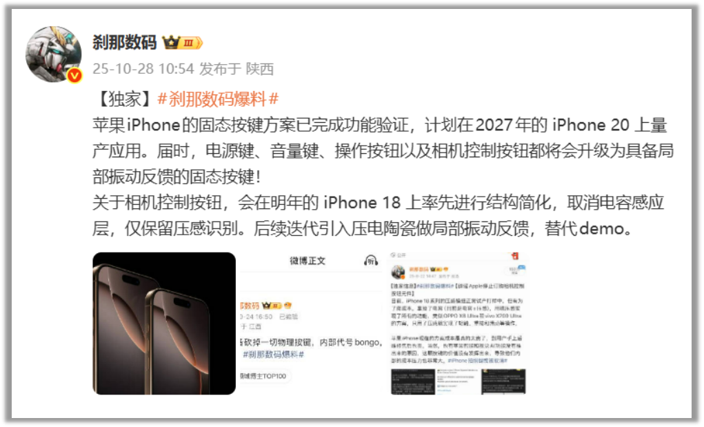 “苹果iPhone的固态按键方案已完成功能验证,计划在2027年的 iPhone 20 上量产应用。届时,电源键、音量键、操作按钮以及相机控制按钮都将会升级为具备局部振动反馈的固态按键!