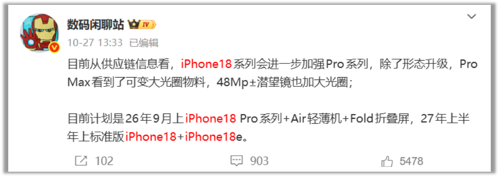 “目前从供应链信息看,iPhone18系列会进一步加强Pro系列,除了形态升级,Pro Max看到了可变大光圈物料,48Mp±潜望镜也加大光圈;目前计划是26年9月上iPhone18 Pro系列+Air轻薄机+Fold折叠屏,27年上半年上标准版iPhone18+iPhone18e。”
