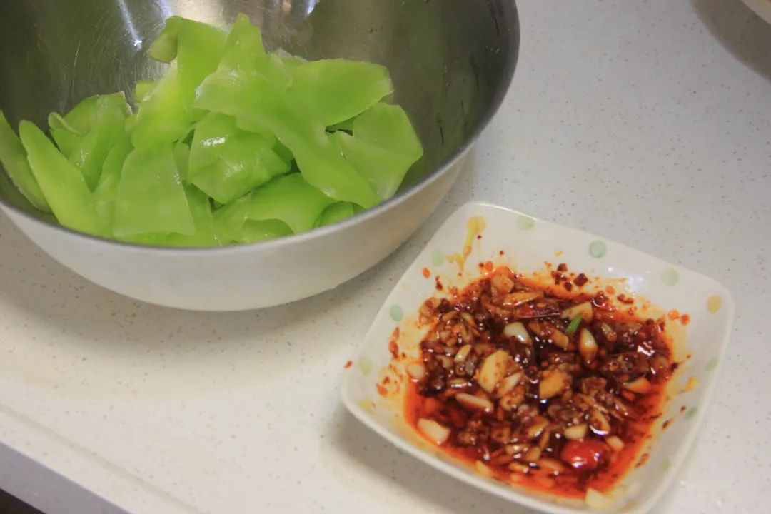我特意多弄了一些料汁,顺带拌了个莴笋片。凉拌莴笋片很适合夏天。