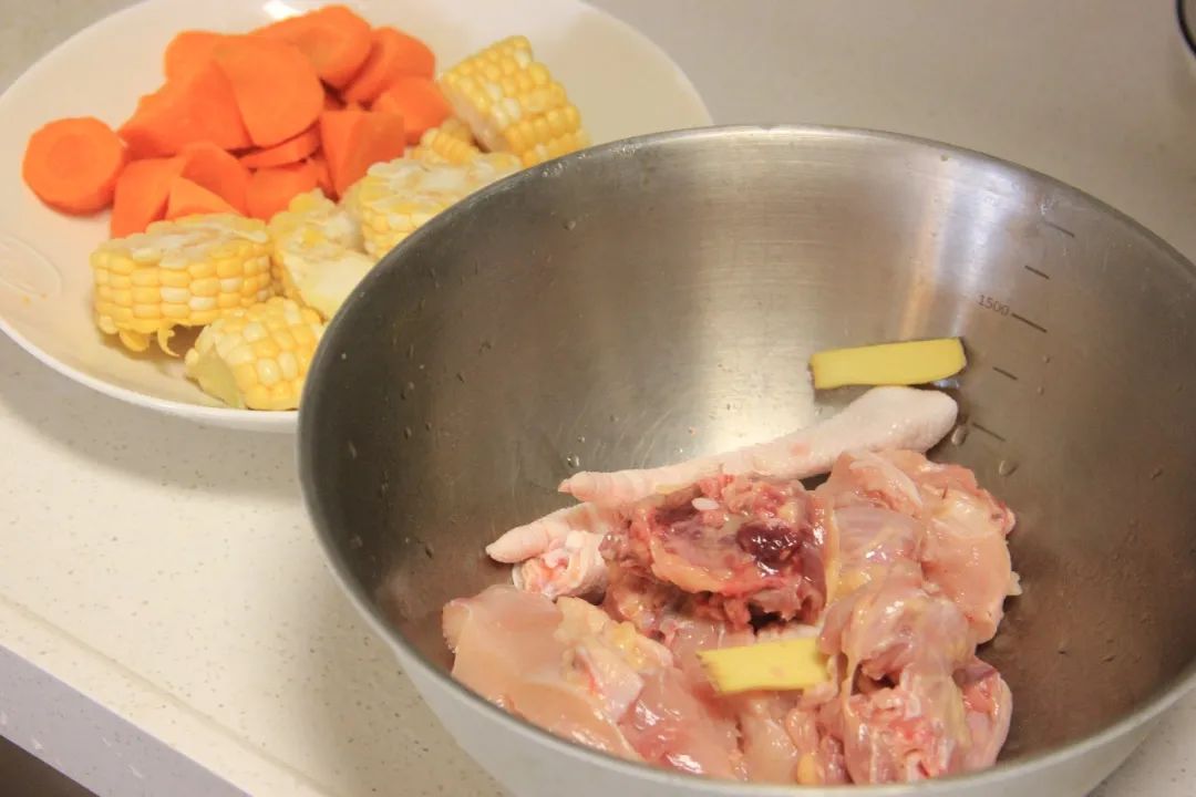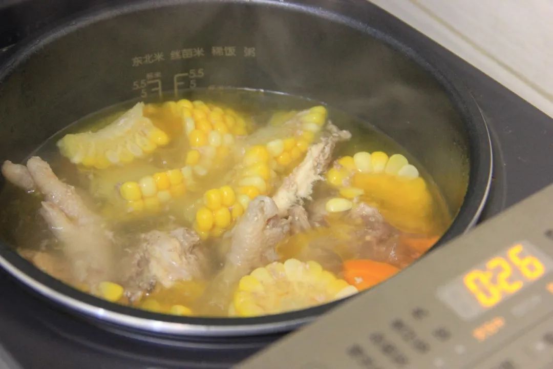 玉米和胡萝卜和鸡块一起炖,汤是甜甜鲜鲜的味道,但这个甜味又是刚刚好的。