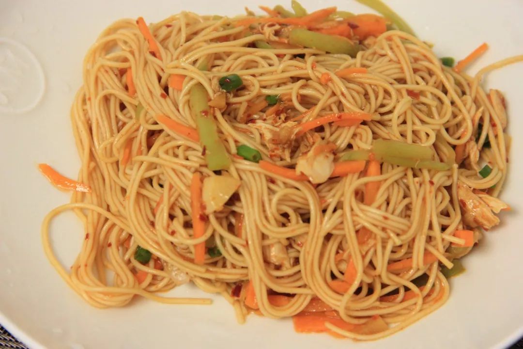 面条弄好后,把胡萝卜丝,莴笋丝,鸡丝,和料汁都加进去, 搅拌均匀, 鸡丝就凉面做好咯。
