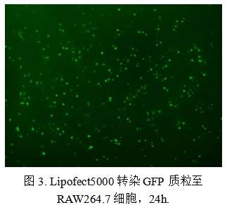 然而,优秀的转染试剂不仅应适用于易转染细胞,也需在难转染细胞中保持较高效率。以RAW264.7细胞为例,该类免疫细胞因兼具半悬浮生长特性及较强免疫原性,导致传统转染方法效率低下。本研究使用Lipofect 5000对传至第四代的RAW264.7细胞进行GFP质粒转染。实验采用含血清、不含抗生素的培养基铺板,待细胞融合度达80%时执行转染。24小时后观察发现,约70%的细胞呈现绿色荧光阳性信号,证明该试剂在该类难转染细胞中仍具备良好的递送能力。