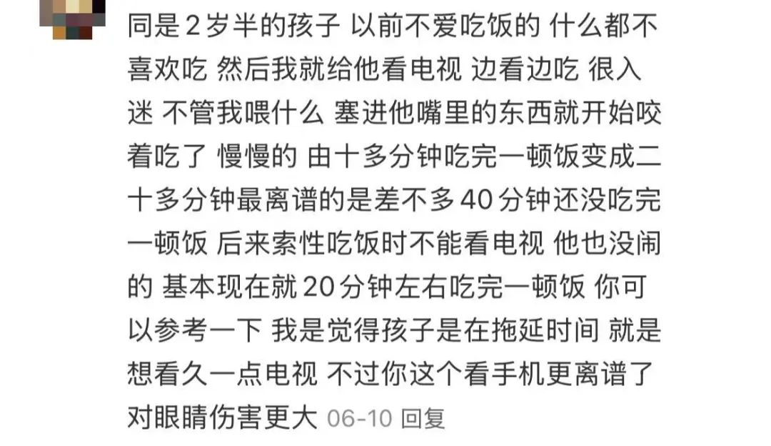 这就是孩子随着年龄的增长,发现了家长喂养方式中的“漏洞”(为了让自己好好吃饭,可以看电视,只要自己吃得足够慢就能看更长时间的电视),为了达到自己多看一会儿电视的目的而拖延吃饭时间。