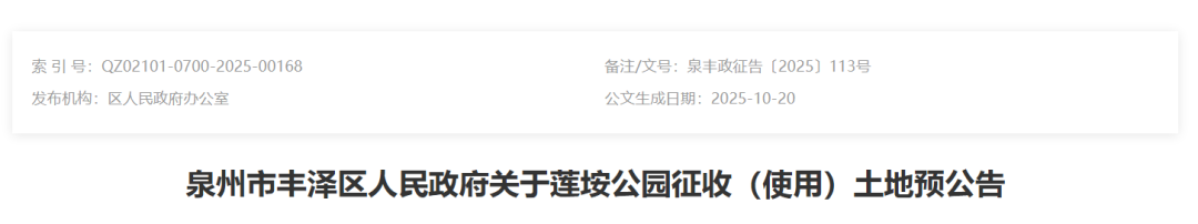 为实施泉州市丰泽区国民经济和社会发展规划、泉州市国土空间规划,根据《中华人民共和国土地管理法》等法律法规的规定,现发布莲垵公园征收(使用)土地预公告: