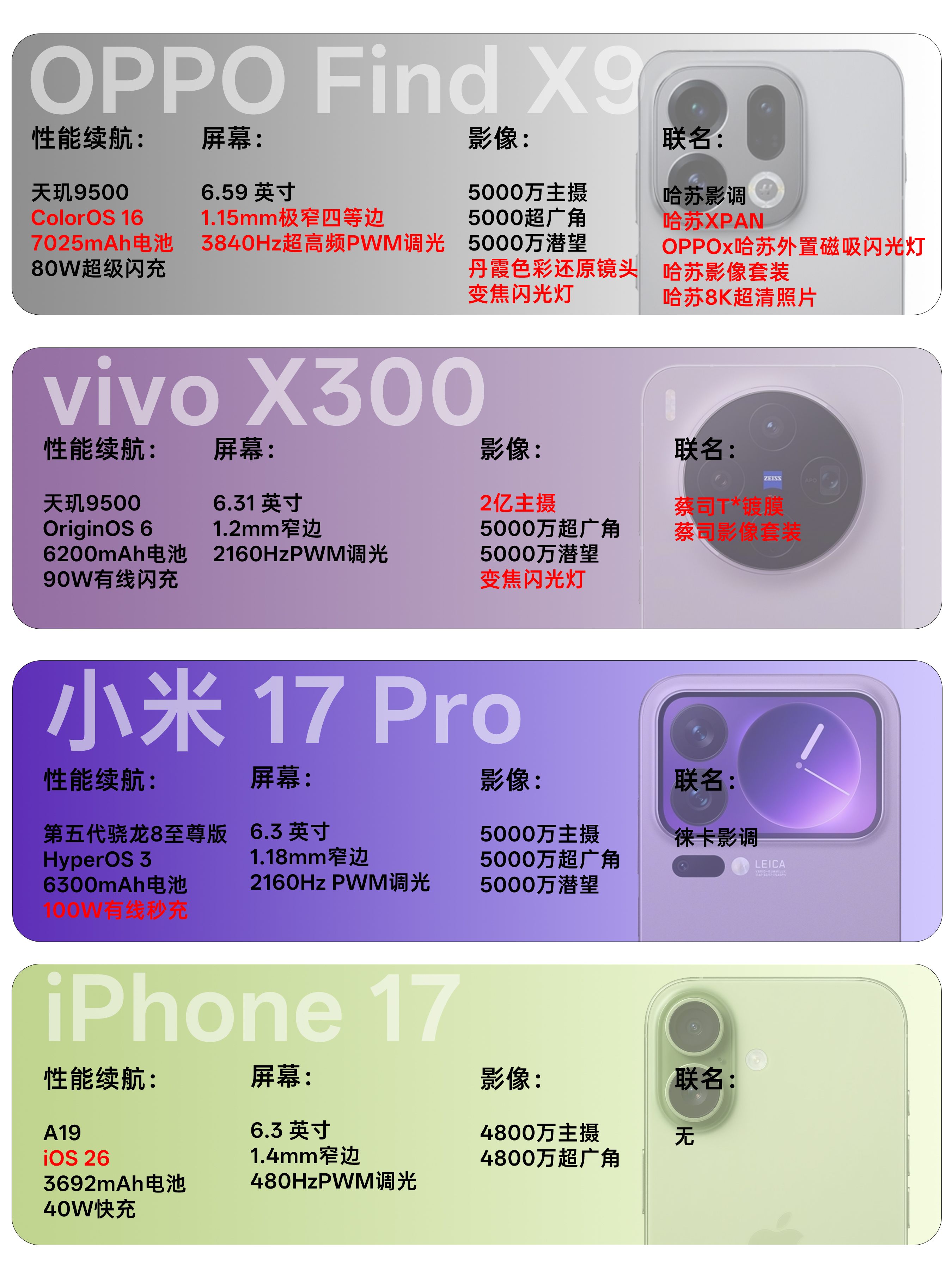 极限四选一!!如果不让你带相机,出去旅游的话,你们会带OPPO Find X9、vivo X300、小米17 Pro、iPhone 17中的哪一台?