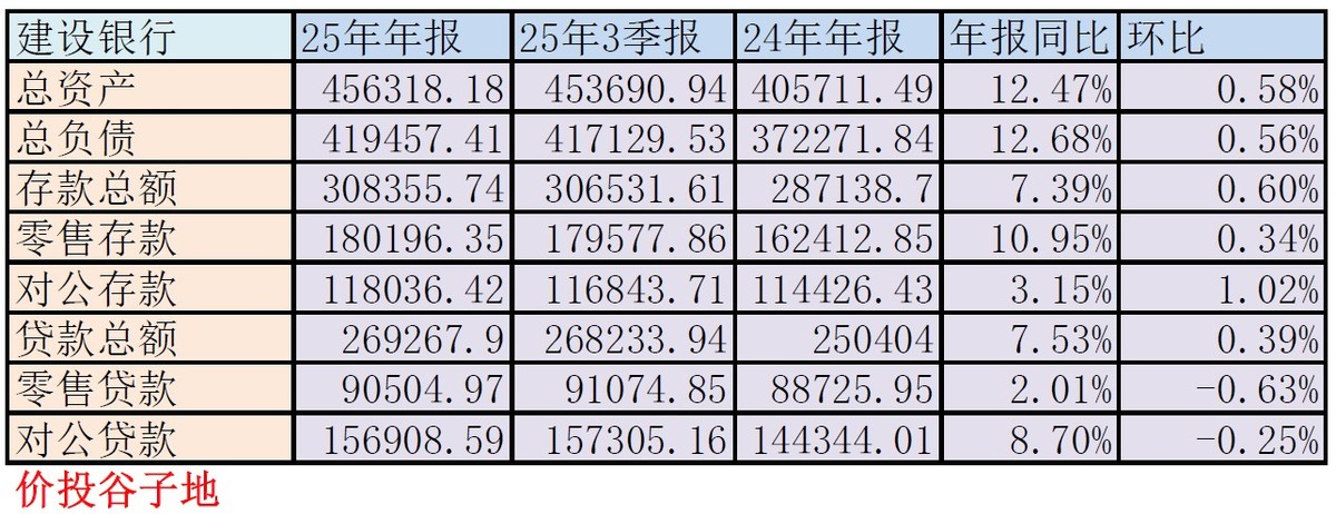 从2025年年报看,建行总资产45.63万亿,同比2024年增长12.47%,同比增速比2024年显著提升。其中,贷款总额26.93万亿,同比增长7.53%。更多的数据请参考表3: