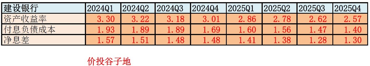 2025年是银行业经营的低谷,连续多年的降息周期,叠加市场信贷需求不足。各家银行的净息差压力都很大。特别是以建行为首的国有大行,本身还肩负着主动降低实体经济融资成本的任务。净利息收入同比负增长是意料之中的。下面我们就来看看建行的净息差数据,如下图1所示: