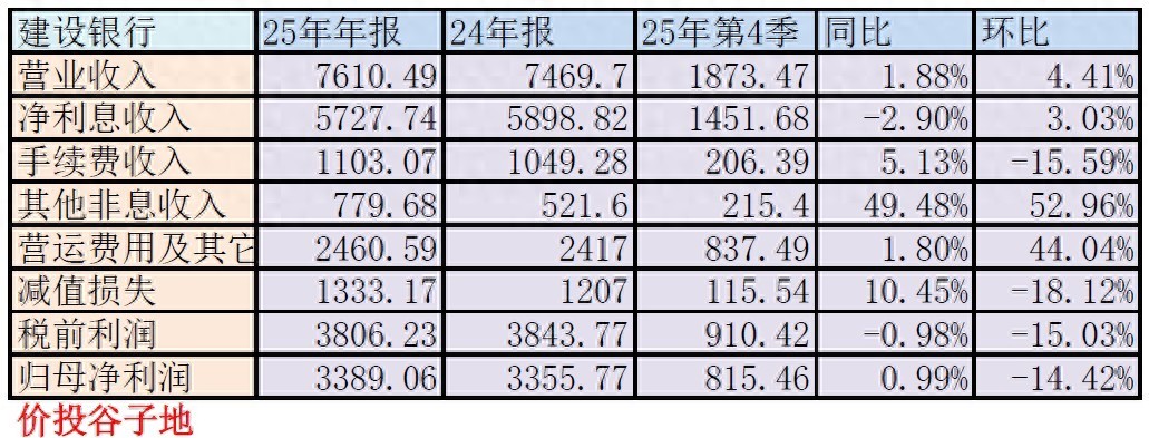 建行2025年年报的营收7610.49亿,同比2024年增长1.88%。其中,净利息收入5727.74亿,同比下降2.9%。手续费收入1103.07亿,同比增长5.13%。其他非息收入779.68亿,同比大幅上涨49.48%。归母净利润3389.06亿,同比增长0.99%。更多的数据参考表1: