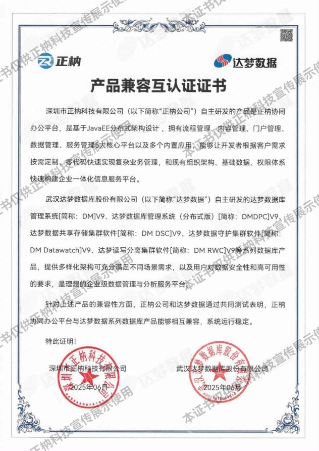 近日,深圳市正枘科技有限公司(以下简称“正枘科技”)与武汉达梦数据库股份有限公司(以下简称“达梦数据”)完成了产品兼容性互认证。正枘科技自主研发的正枘协同办公平台开展了兼容性测试,测试结果显示,上述两方产品彼此完全兼容,产品整体运行稳定且高效,性能表现优异。