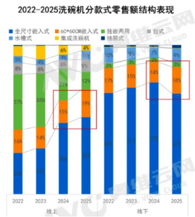根据奥维云网的数据,随着存量房改需求的逐步释放,不需要挤占原有空间的嵌入式洗碗机在过去一段时间正在成为市场增长的亮点,其在2025年在线上线下的市场份额都增长了4%。
