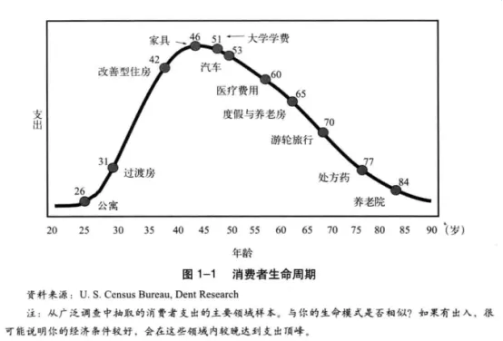 暂且先把目光投向大洋彼岸。美国人口学家哈瑞.丹特曾经针对美国社会提出这样一种观察:随着工作经历/薪资的增长、家庭成员变化的需求以及对应消费心理的变化,美国人通常在40岁后会进入家庭开支的上升期,并在46岁左右达到高峰,其主要的资金投入方向是与房产相关的家具和家居开支。