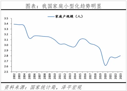 其次,由于社会环境和政策引发的观念延续等因素,我国家庭户均规模已经从上世纪80年代初的4.4人降至2023年的2.8人,与美(2.53)、日(2.27)、韩(2.4)相去不远。家庭户小型化的同时,作为成婚家庭主体之一的85-95群体可能还会产生追求更大人均住房面积的需求。