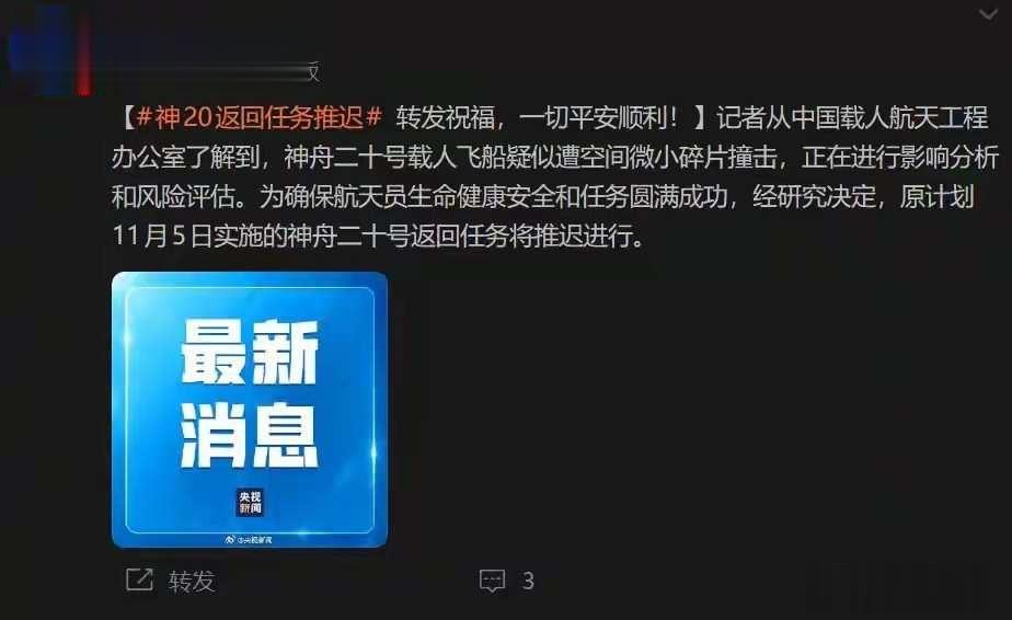 最近神舟二十号飞船没有按照计划返回地球,大家都非常关心这件事,官方没有详细说明具体原因,只提到对接天宫空间站时可能被小块太空垃圾撞击,现在飞船还在轨道上运行,地面团队正在抓紧检查情况,返回时间需要等待检查结果出来后再做决定。