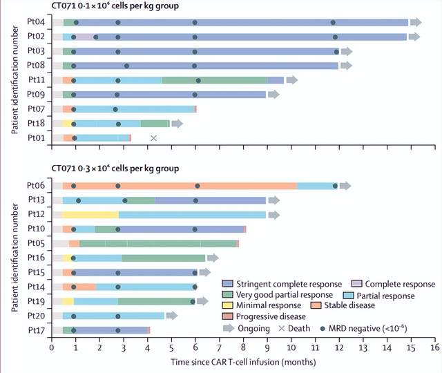 共20例患者接受了CT071输注,结果显示:客观缓解率(ORR)高达100%,10例(50%)患者获得严格完全缓解(sCR),4例(20%)获得非常好的部分缓解(VGPR),6例(30%)获得部分缓解(PR),6个月无进展生存率为78%,12个月无进展生存率为64%。
