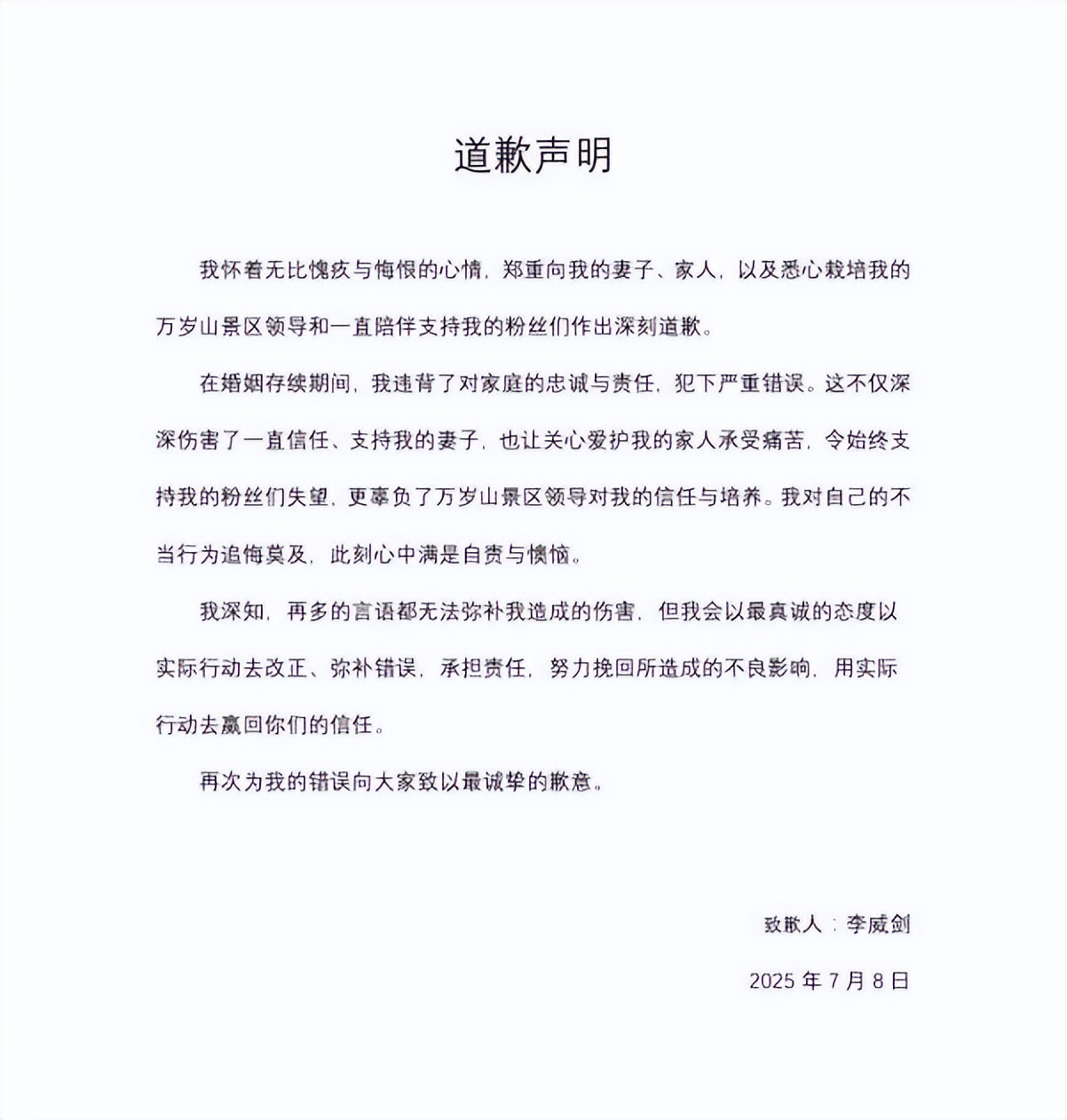 七月那会儿,婚内跟榜一大姐有事,女方说不知情就发生了关系,剑剑说不是故意瞒,女方没问结婚没结婚,直播里跟粉丝互动亲密,那是工作需要,有分寸,粉丝群聊天记录直接摆出来,承认跟女粉丝有事,事情一闹大,景区直接辞退,剑剑自己发道歉信,承认对家庭不忠,犯错了。