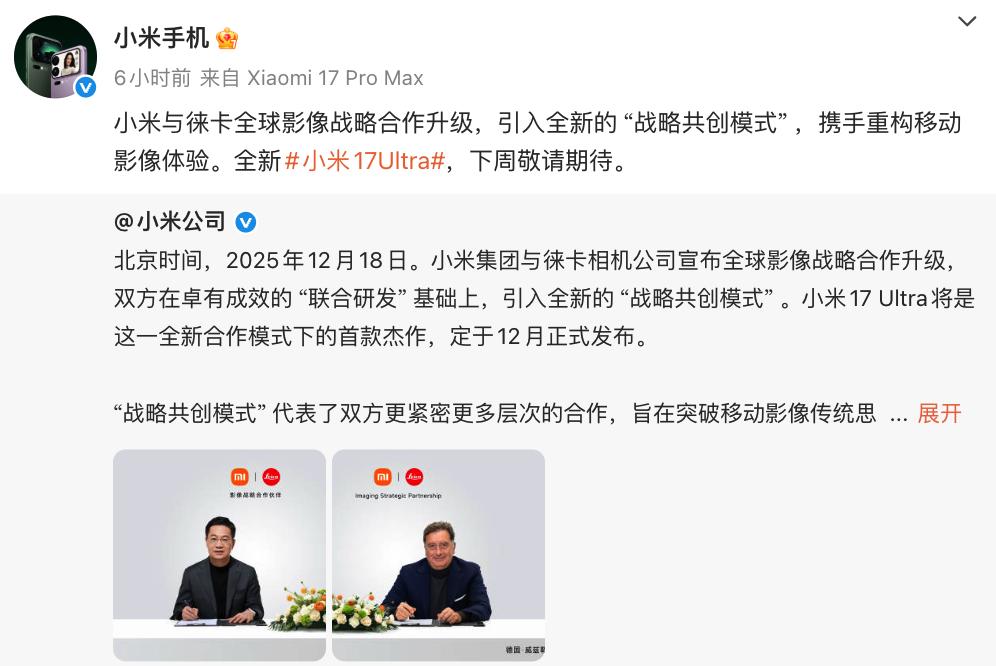 小米手机官方消息显示,小米与徕卡全球影像战略合作升级,引入 “战略共创模式” ,携手重构移动影像体验。