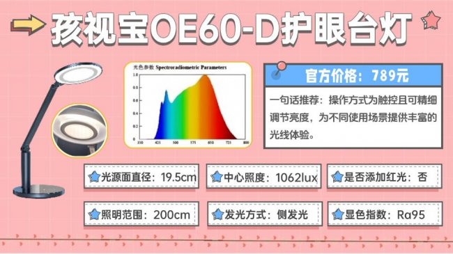 2026年小孩护眼灯怎么选之抄作业孩视宝OE60—D儿童护眼灯推荐:它采用19.5厘米的圆形发光面配合上面环双光源技术,照明覆盖非常广,能照亮1米8以上桌面,适合大桌或多人共用场景。此外它还支持3000K到5000K色温切换,日常各个使用场景都能适配,显色方面Ra值为95,色彩可以还原的比较自然,整体更偏向实用型设计。
